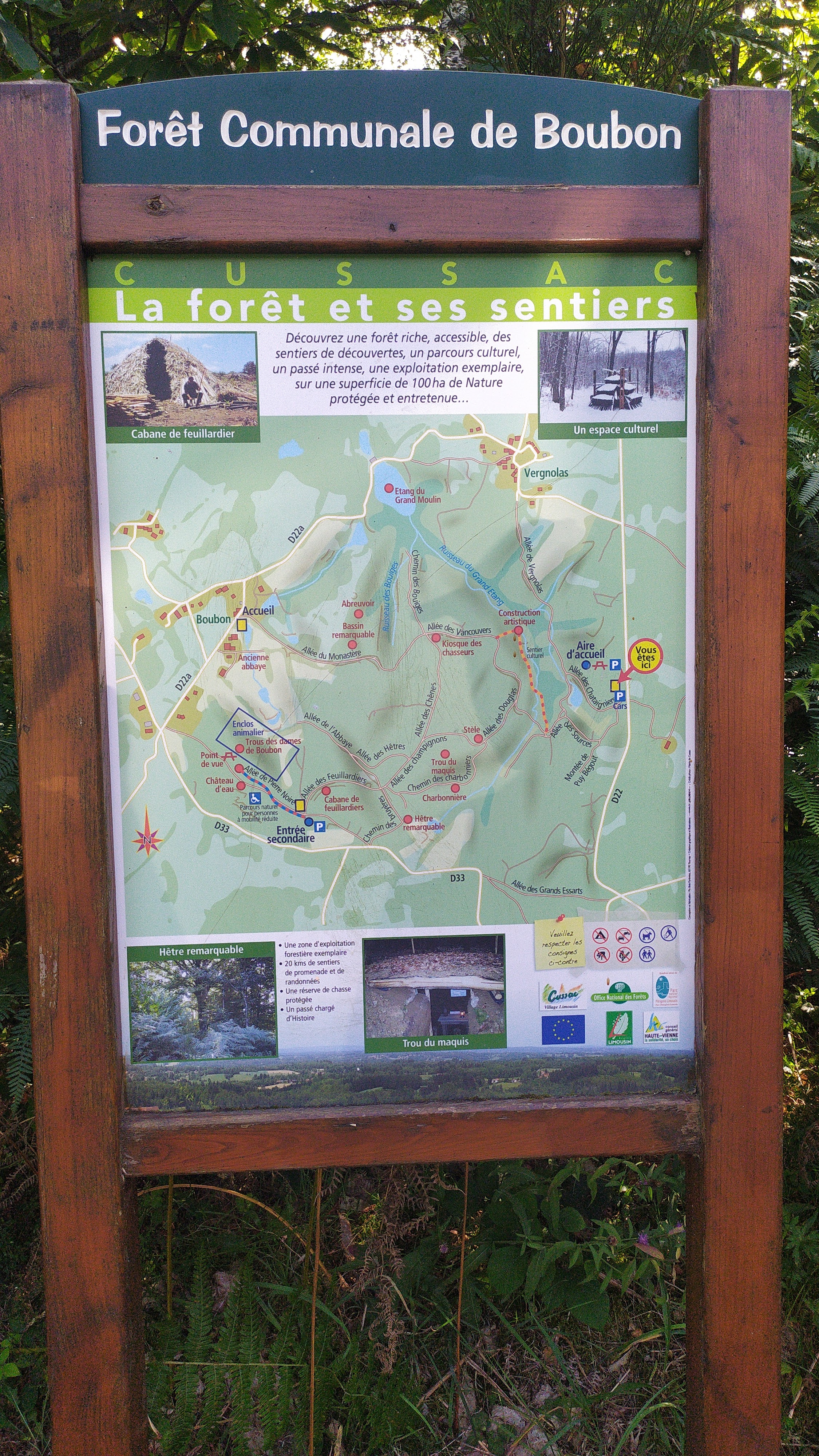 Parking en bon état et très accessible. Panneaux indiquant les lieux d'intérêt ainsi que balises d'orientation. Chemins bien entretenus ! Un peu de dénivelé qui rend la promenade intéressante mais pas insurmontable même pour un marcheur en herbe. Aménagements retraçants le maquis local présent pendant l'occupation allemande. Joli panorama en bout de forêt surplombant le Val.