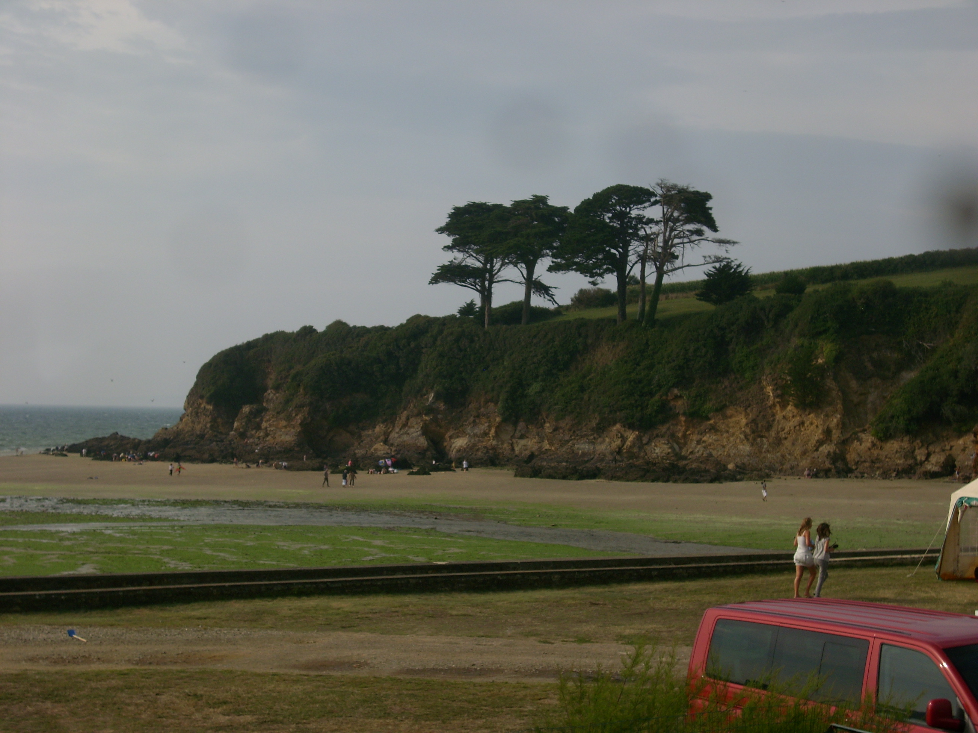 En venant de l'intérieur, première belle vue sur la mer et Douarnenez en arrière plan. Taille de la plage très dépendante de la marée, elle se resserre à marée haute. Il n'y a que quelques places de parking...